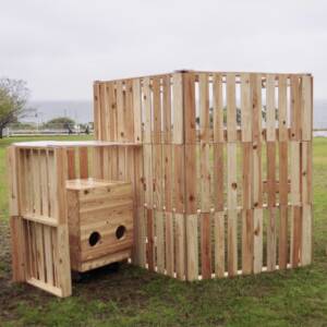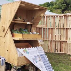 私たちは、無人販売所が行商人のように自ら動き、野菜を販売する未来を目指します。今回は小屋という原点に立ち返り、過去作品を格納でき、人も入れる規模の小屋を考えました。最大の特徴は、野菜を入れるカゴを組み合わせて作られている点です。